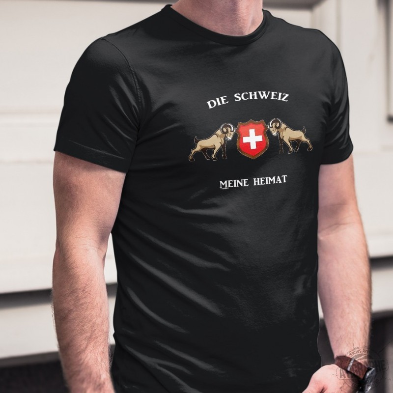 T-Shirt aus 100% Baumwolle mit der deutschen Aufschrift ✚ Die Schweiz, meine Heimat ✚ und zwei Steinböcken rund um das Schweizer Abzeichen