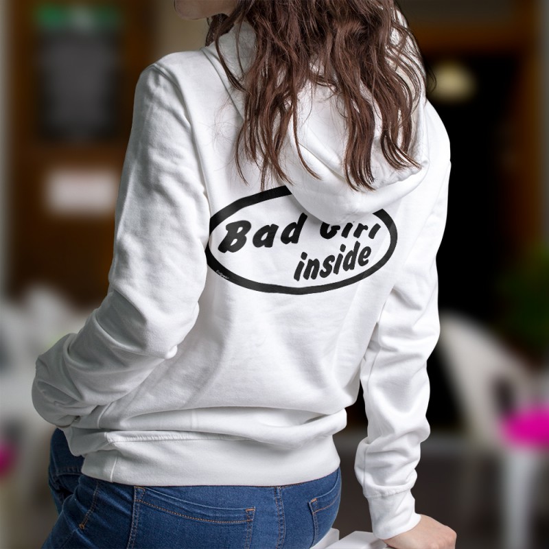 Kapuzenpulli mit dem Slogan " Bad Girl inside " illustriert. Eine Form von Wink zum Slogan von Intel