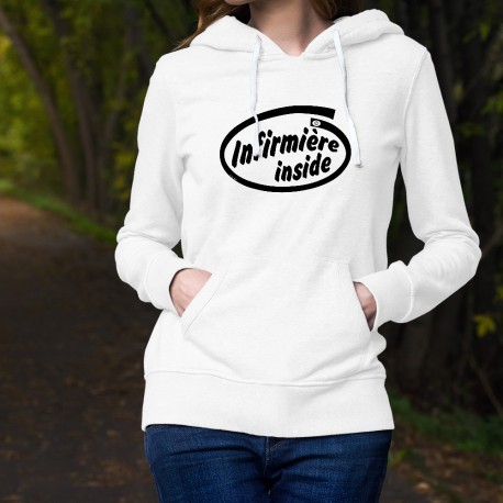 Kapuzen-Sweatshirt mit dem Slogan " Infirmière inside " illustriert. Eine Form von Wink zum Slogan von Intel