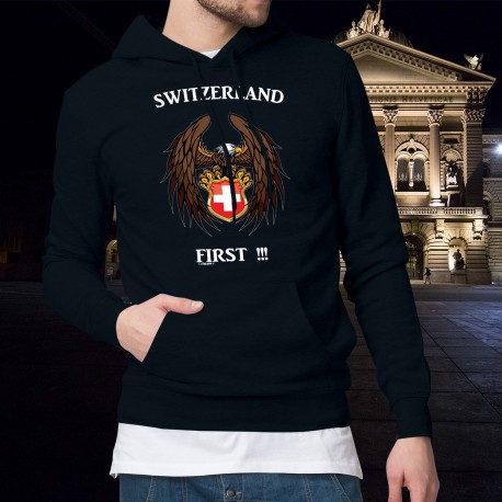Baumwoll-Kapuzenpulli mit dem Zitat ✚ Switzerland First ✚ Die Schweiz zuerst ✚ eines Adlers, der das Wappen der Schweizerischen Eidgenossenschaft zwischen seinen Krallen hält