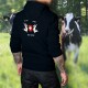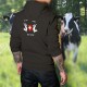 Baumwoll-Kapuzenpulli mit ✚ In Switzerland We Trust ✚ In der Schweiz vertrauen wir ✚ und zwei reinrassige Holstein-Kühe umrahmen das Schweizer Wappen