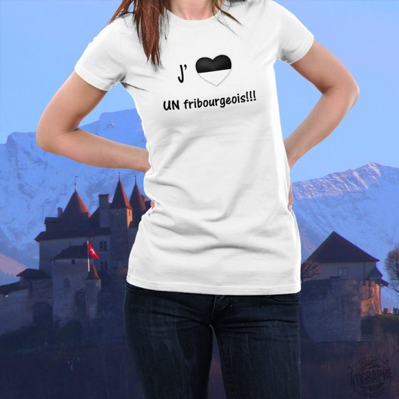 Frauen T-shirt mit "J'aime UN fribourgeois" illustriert.