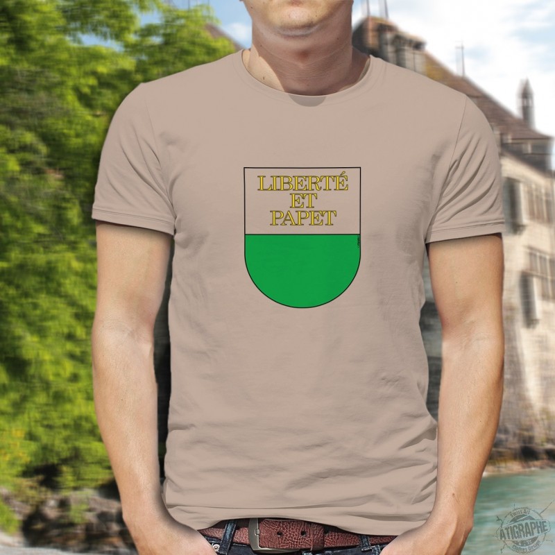 T-shirt mit der Waadtländer Wappen und dem Slogan "Liberté et Papet" illustriert