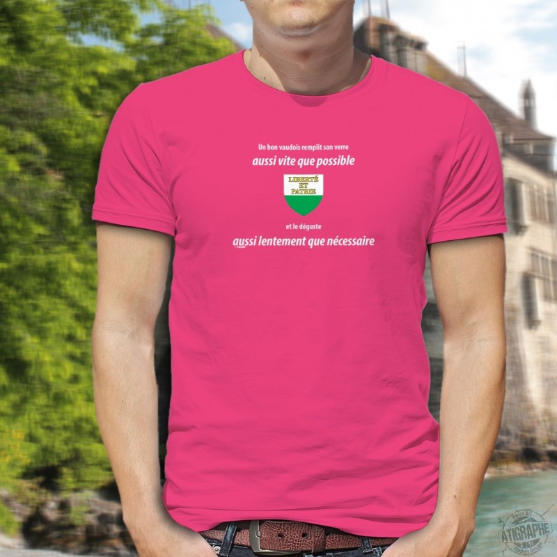 T-Shirt aus 100% Baumwolle illustriert mit der Erwähnung ✚ Un vaudois remplit son VERRE aussi vite que possible ✚
