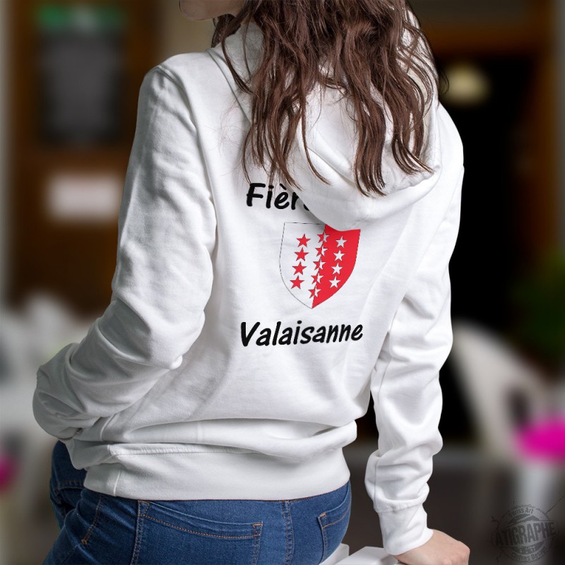 Kapuzen-Sweatshirt für Frau, mit der Walliser Fahne und dem Slogan "Fière d'être Valaisanne" illustriert.