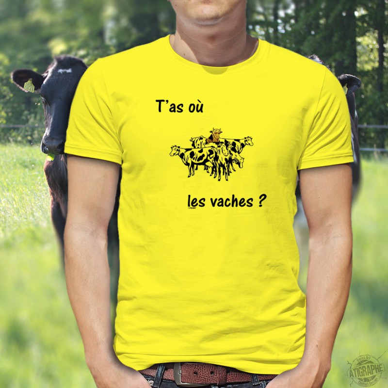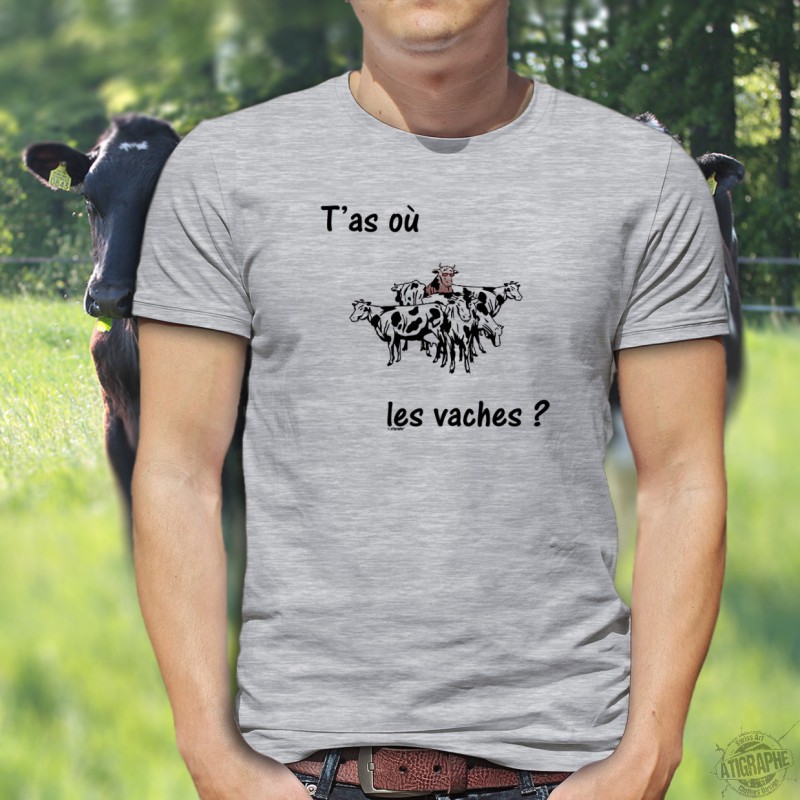 Männer T-Shirt illustriert mit dem französischen Wallis-Zitat "T'as où les vaches?" eine humorvolle Bergvariante von "T'as où les vignes?" verwendet in der Rhône-Ebene