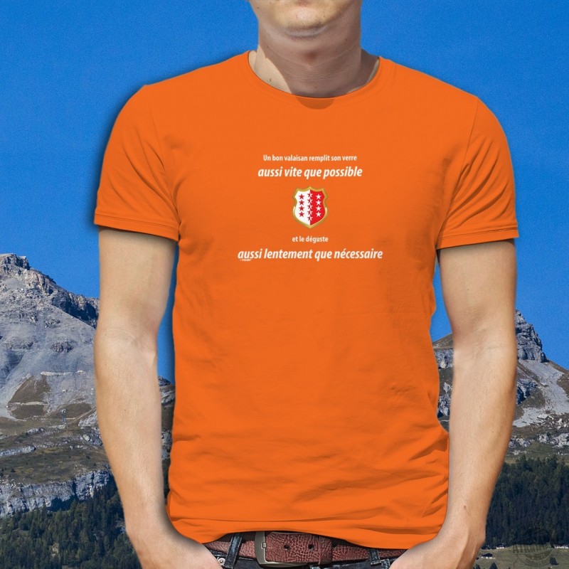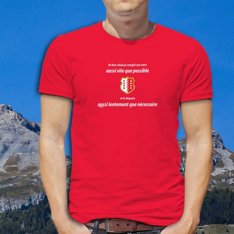 T-Shirt aus 100% Baumwolle illustriert mit der Erwähnung ✚ Un valaisan remplit son VERRE aussi vite que possible ✚