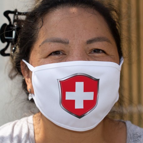 Double-layer protective tissu mask washable many times at 60 ° C, with the Switzerland coat of arms, a white cross under a red background, surrounded by silver