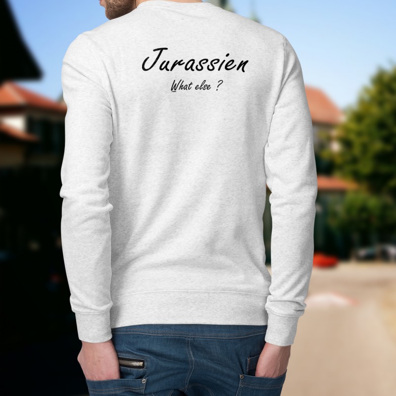 Men's sweatshirt, illustrated with the quotation "Jurassien, What else?", A digression of the famous phrase of George Clooney in the advertisements for the brand of coffee