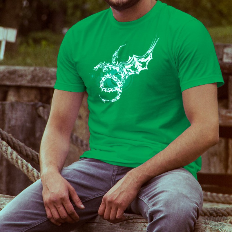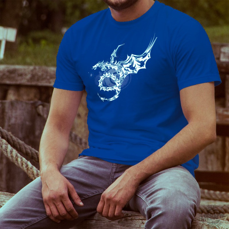 100% cotton T-shirt with a winged tribal dragon in a challenging pose facing a series of concentric circles, representing the orbit of planets and stars in the universe