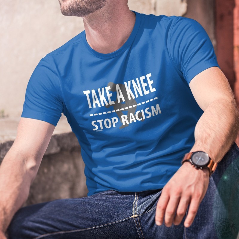 Men's 100% cotton T-shirt with the slogan ✪ TAKE A KNEE ✪ STOP RACISM ✪. A donation of 4 CHF to the GRA, Foundation against racism and anti-Semitism will be made for each T-shirt sold, in memory of George Floyd and all the other victims