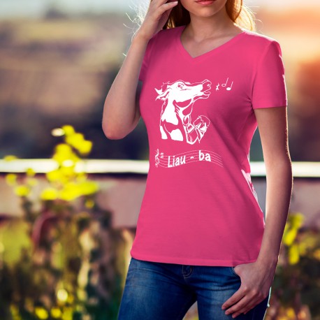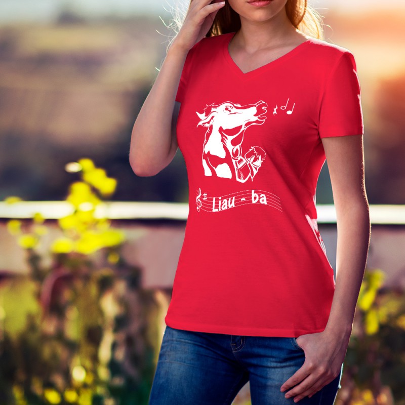 Lady fashion cotton t-shirt in a very feminine cut, illustrated with a cow singing and the quote "Liauba", a nod to the Ranz des Vaches of Gruyère