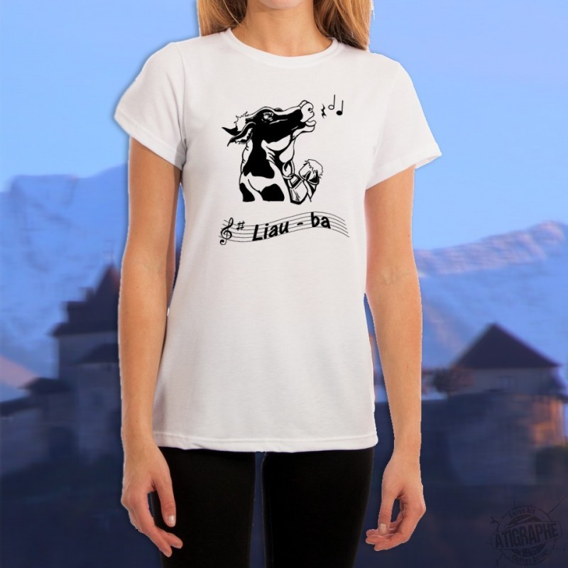Fashion t-shirt in a very feminine cut, illustrated with a cow singing and the quote "Liauba", a nod to the Ranz des Vaches of Gruyère