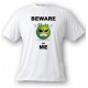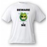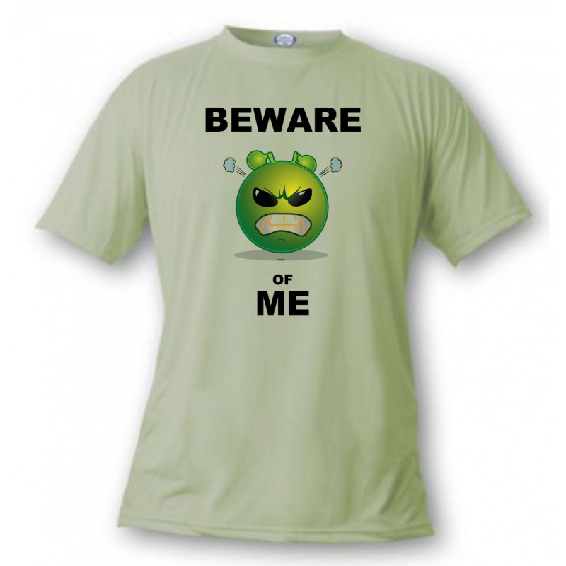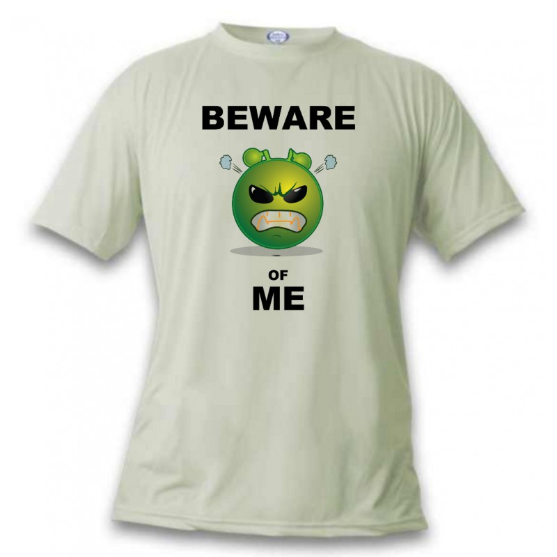Humorous T -shirt illustrated with an angry Alien Smiley and humorous adaptation of the quote " Beware of Dog "