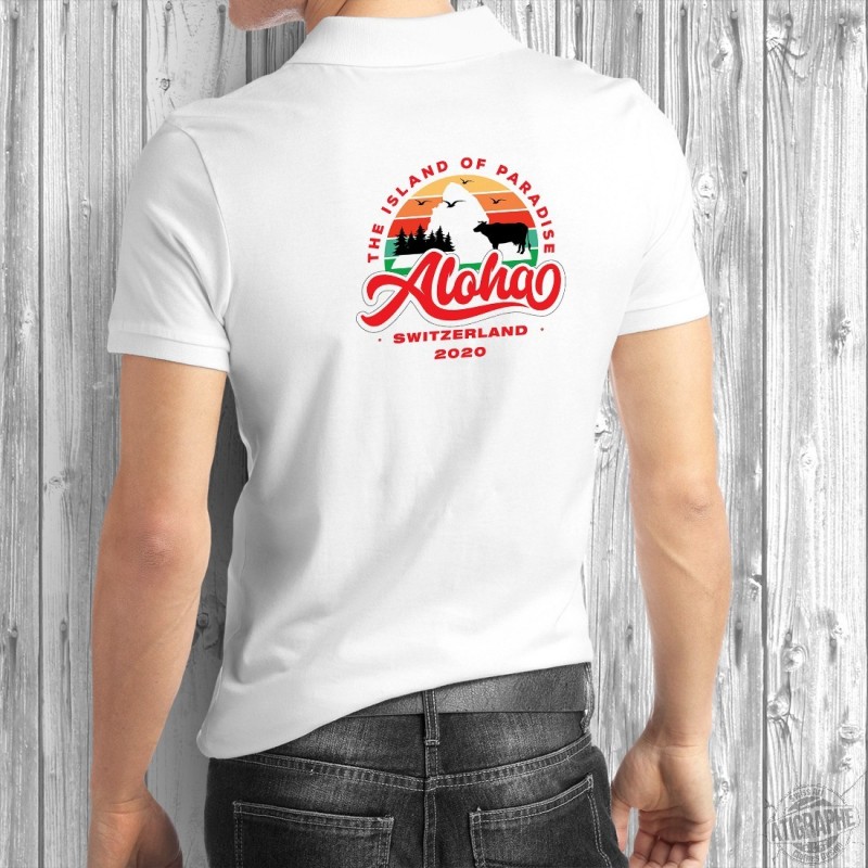 Polo shirt with a cow, the Matterhorn, fir trees and ❤ Aloha Switzerland 2020 ❤ The Island of Paradise ❤ In memory of your summer vacation 2020