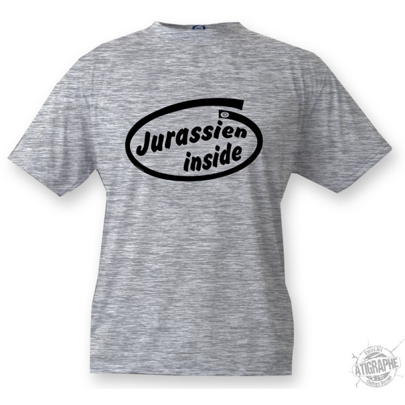 Humorous tee-shirt illustrated with the slogan "Jurassien inside", in tune with the slogan of Intel and the people of the canton of Jura