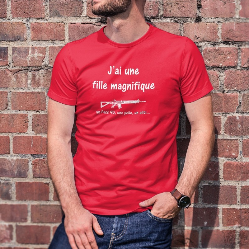 Men's Fashion cotton T-Shirt illustrated with humorous french quote, "J'ai une fille magnifique, un Fass 90... ★"