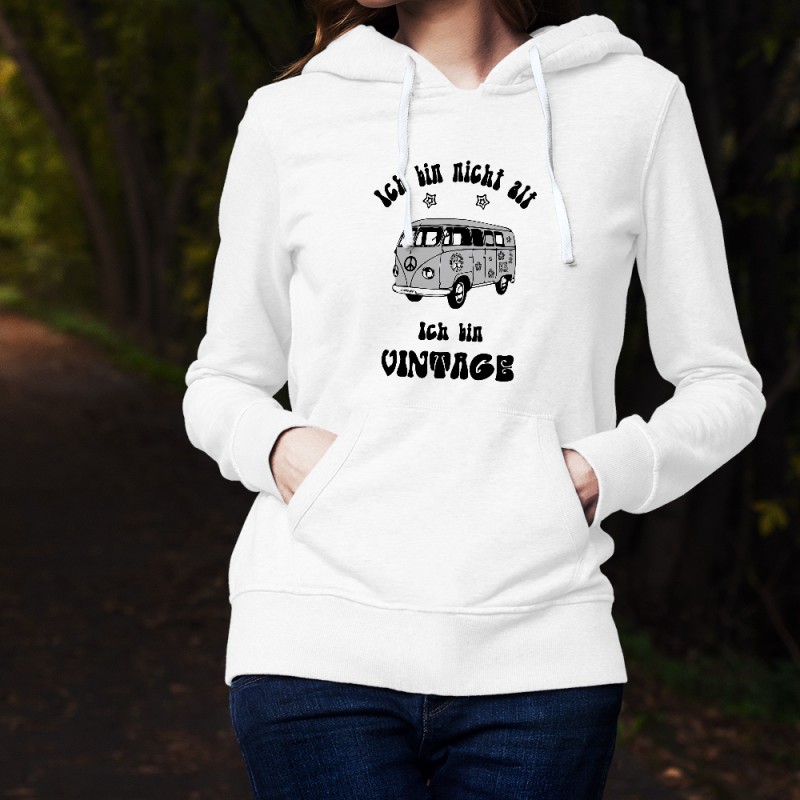 Lady's fashion Hooded Funny Sweat illustrated with the famous Volkswagen Camper and the humourous german quote "Ich bin nicht alt, Ich bin Vintage"