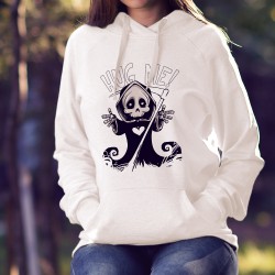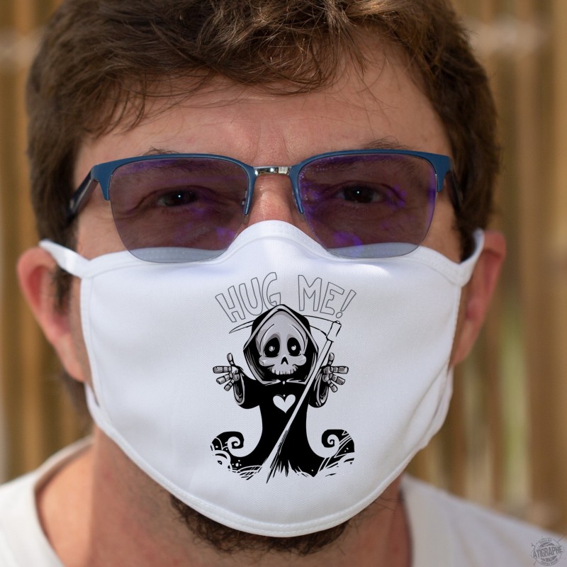 Double-layer protective tissu mask washable at 60 ° C illustrated with a version of the reaper in search of a hug and quote "Hug me"