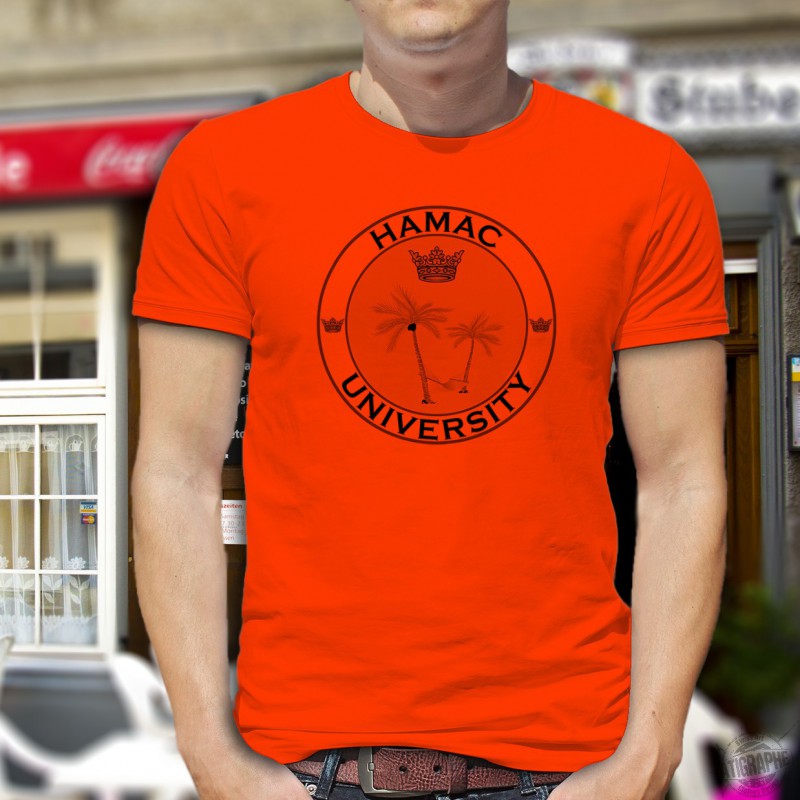 Men's fashion t-shirt illustrated with the coat of arms of the famous HAMAC University, renowned for its courses on sleep and lazing around