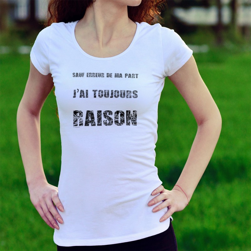 Fashion T-shirt in a very feminine cut illustrated with the humorous french quotation "Sauf erreur de ma part, j'ai toujours raison"