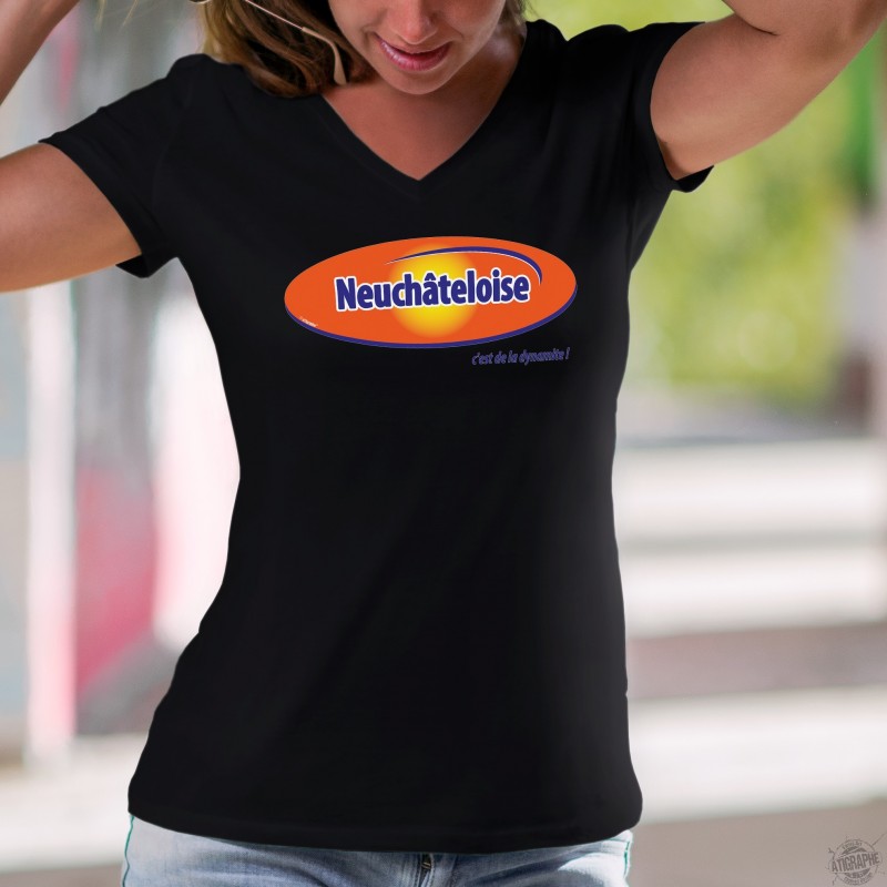 Lady fashion cotton T-shirt illustrated with the french quote "Neuchâteloise, c'est de la dynamite"