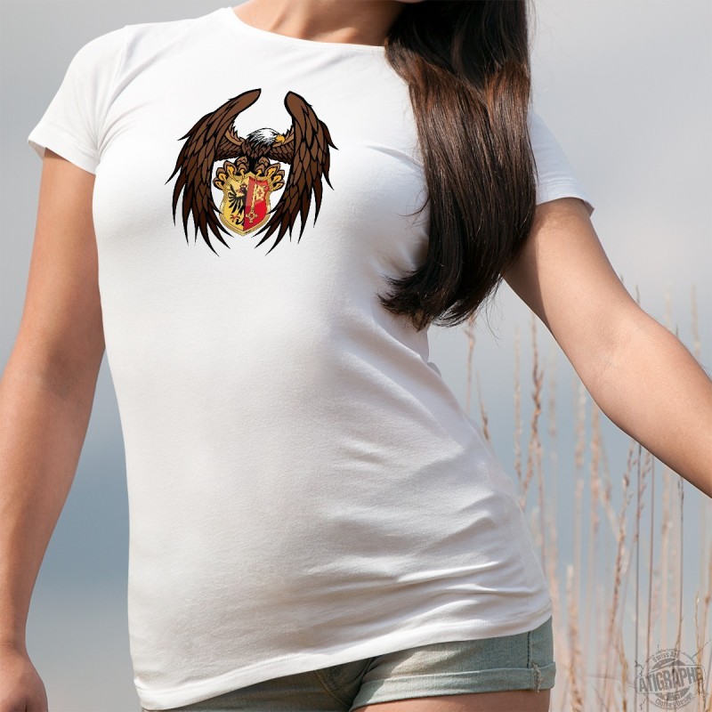 Women's fashion T-Shirt illustrated with an eagle holding the blazon of the canton of Geneva between its claws.
