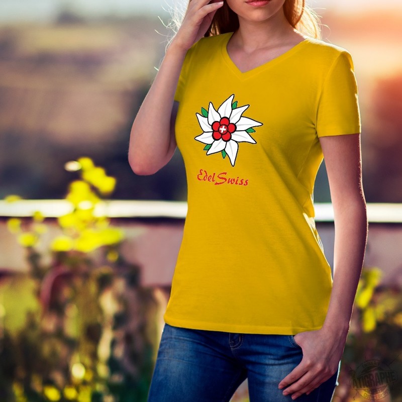 Lady fashion cotton t-shirt in a very feminine cut illustrated with a swiss colored Edelweiss