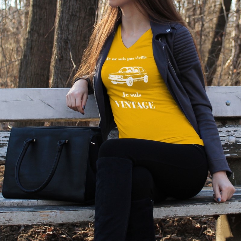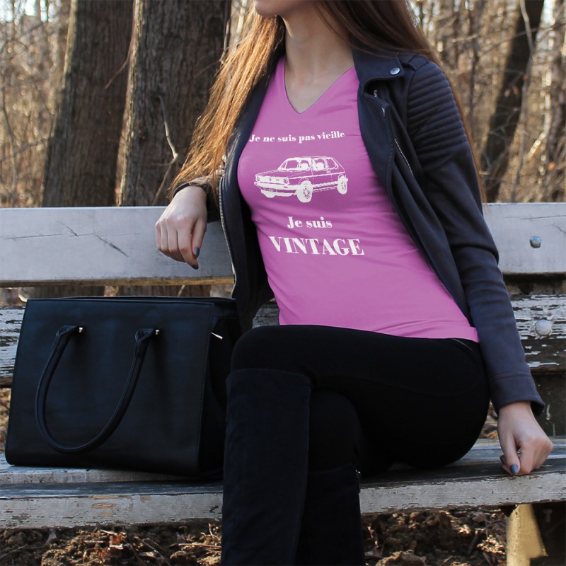 100% cotton ladies' fashion t-shirt in a very feminine cut illustrated with the french humourous quote "Je ne suis pas vieille, je suis Vintage" and an old VW Golf GTI MK1