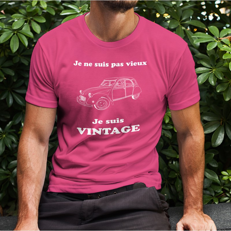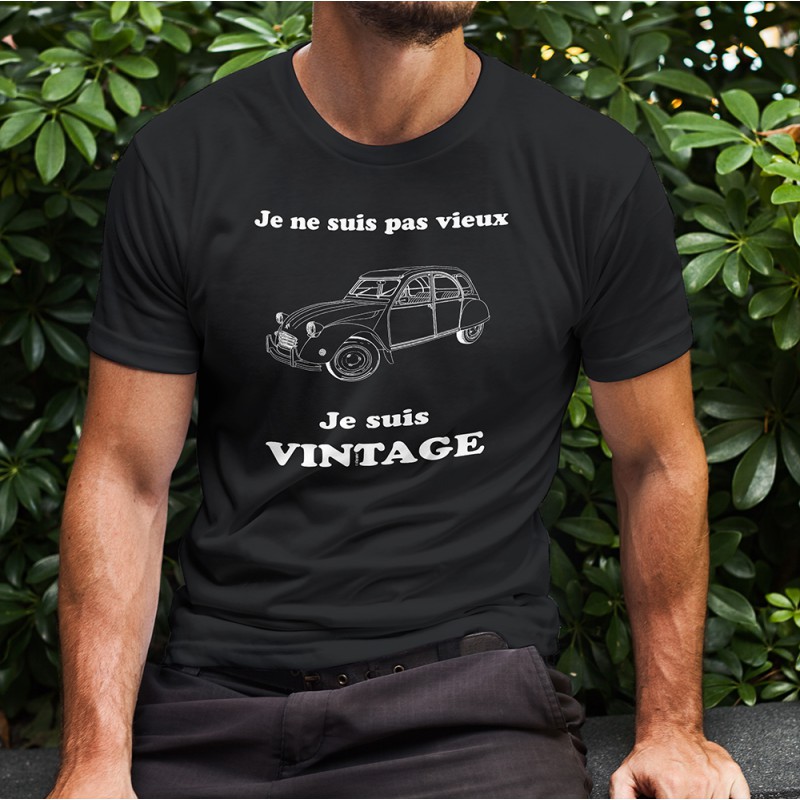 Men's cotton T-Shirt illustrated with the humorous french quote "Je ne suis pas vieux, je suis vintage" and a Citroën 2CV