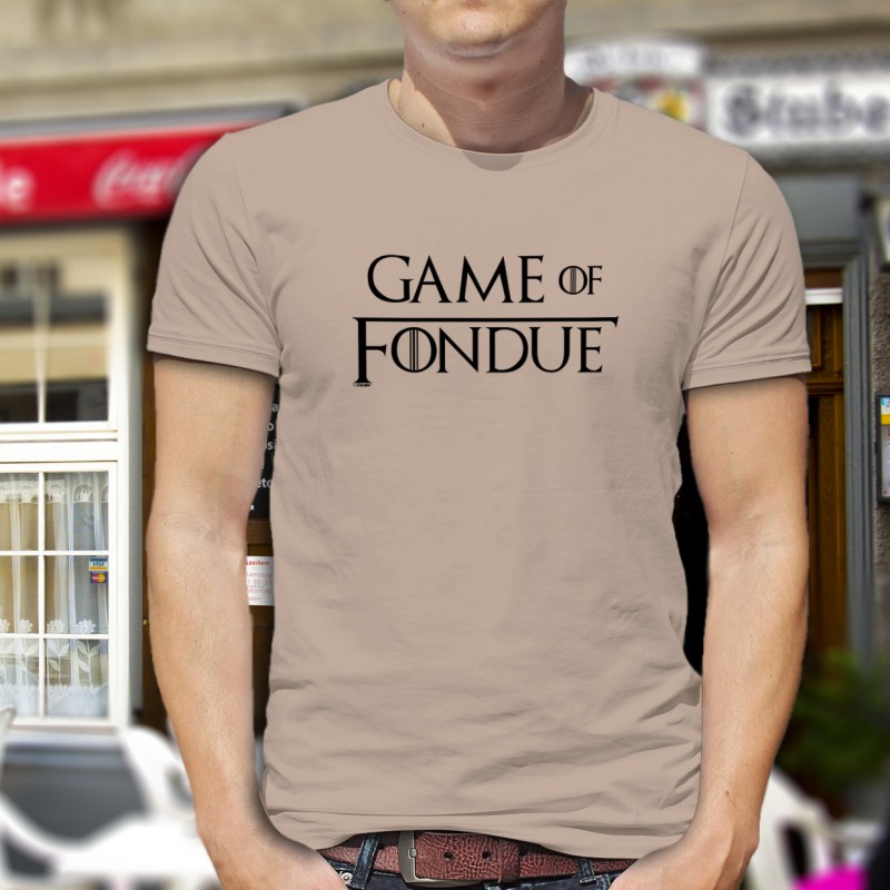 Men's T-shirt illustrated with the quote "Game of Fondue" a humorous digression inspired by the famous TV series "Game of Thrones"