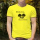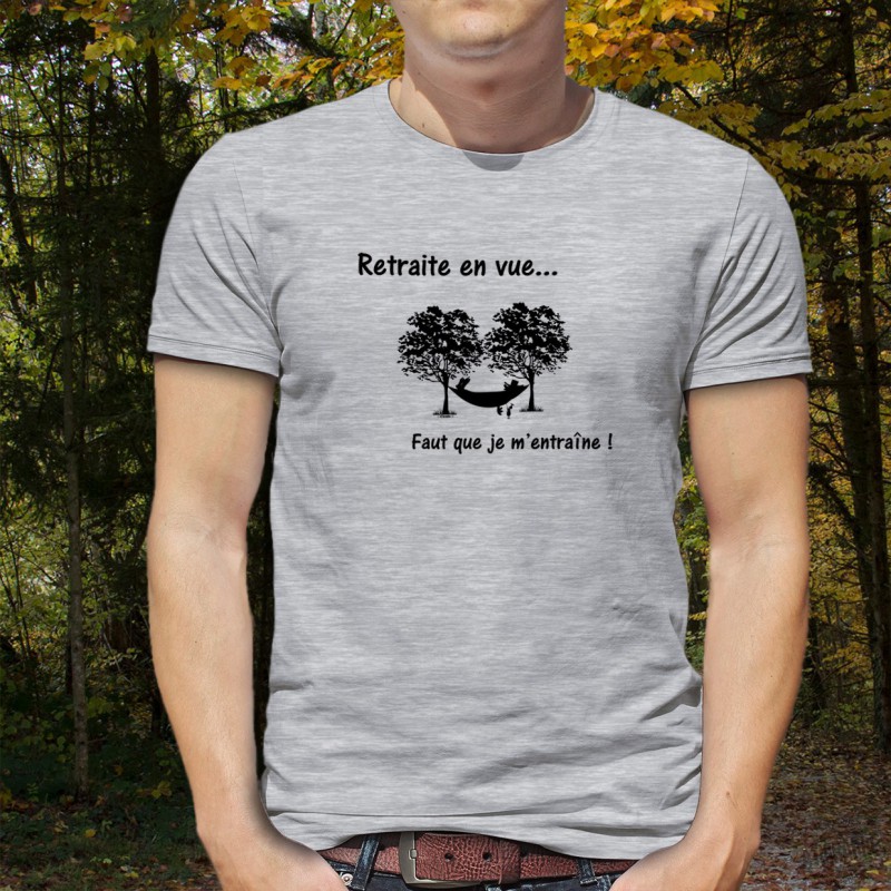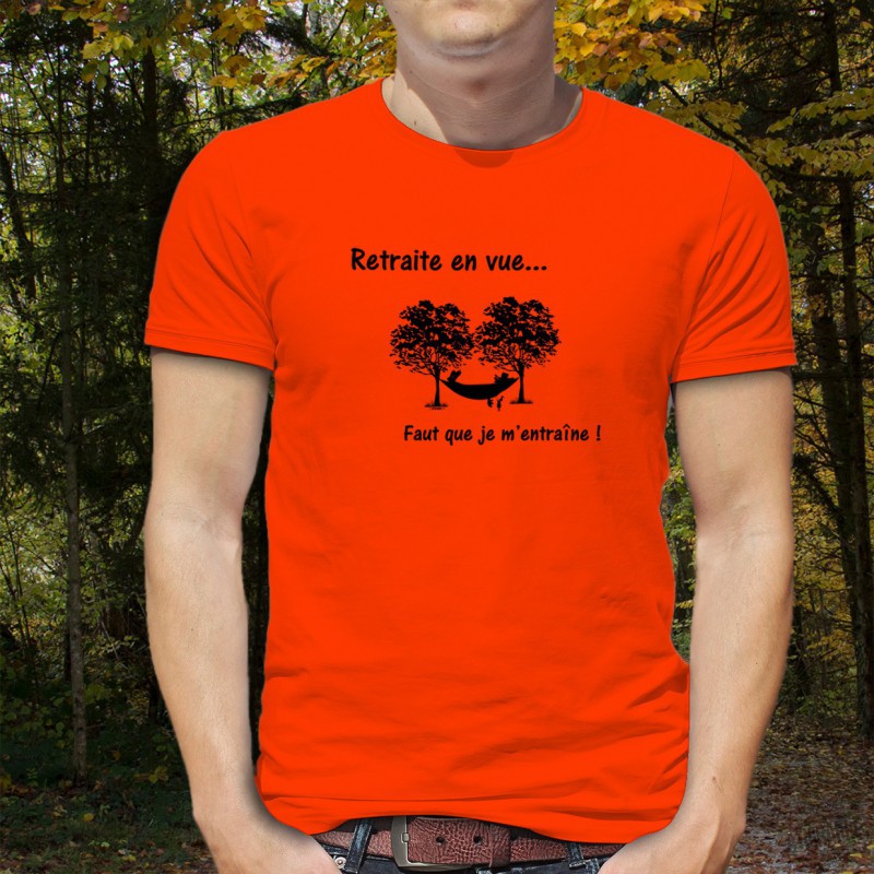 Fashion man t-shirt illustrated with a man asleep in a hammock hanging between two trees and the french quote "Retraite en vue, faut que je m'entraîne !"