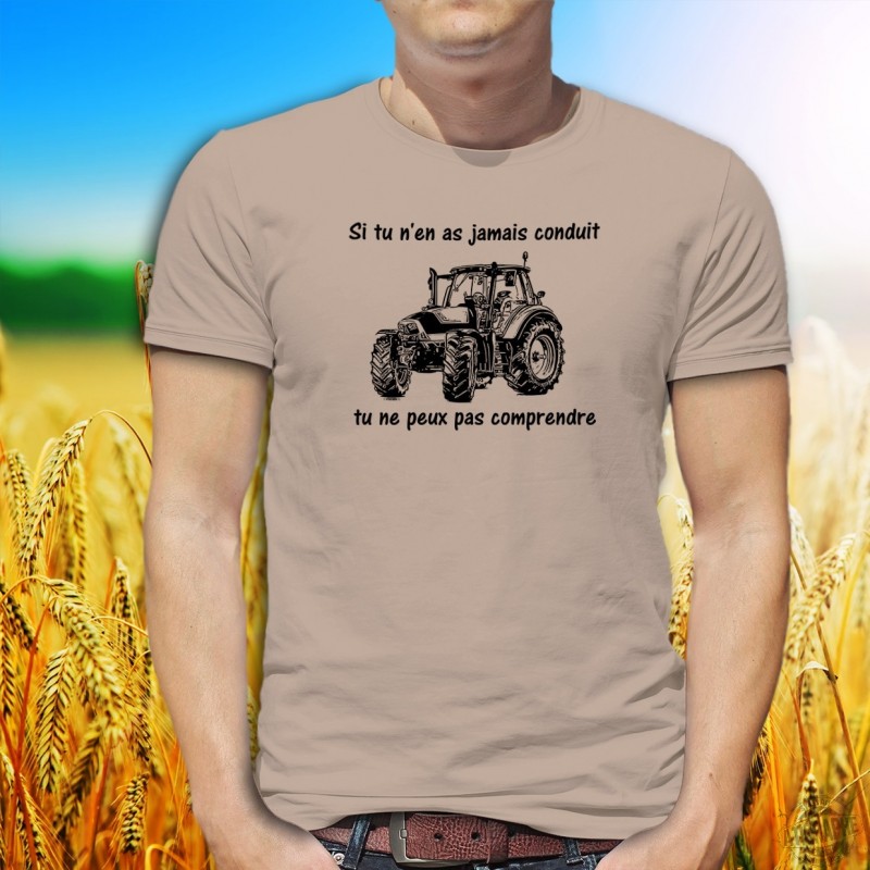Humourous T-shirt illustrated with a big modern tractor and quote in French " Si tu n'en as jamais conduit, tu ne peux pas comprendre"