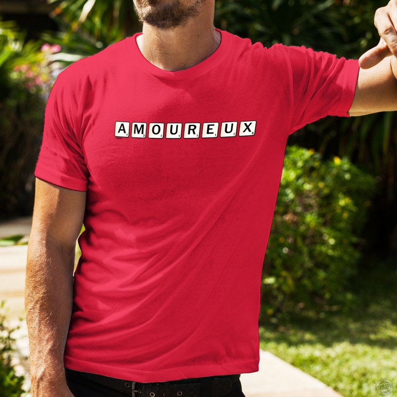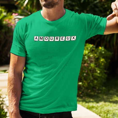 Men's Fashion cotton T-Shirt illustrated with humorous french quote, "Amoureux"