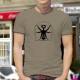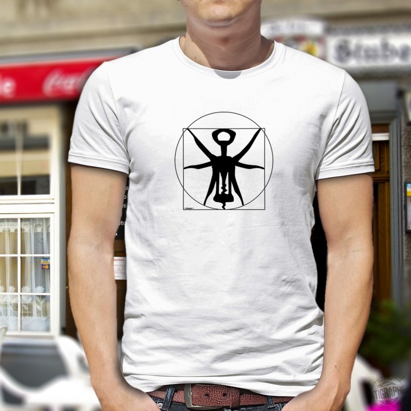 T-shirt illustrated with the representation of the ideal proportions of the corkscrew inscribed in a circle and a square. New version of Leonardo da Vinci's drawing