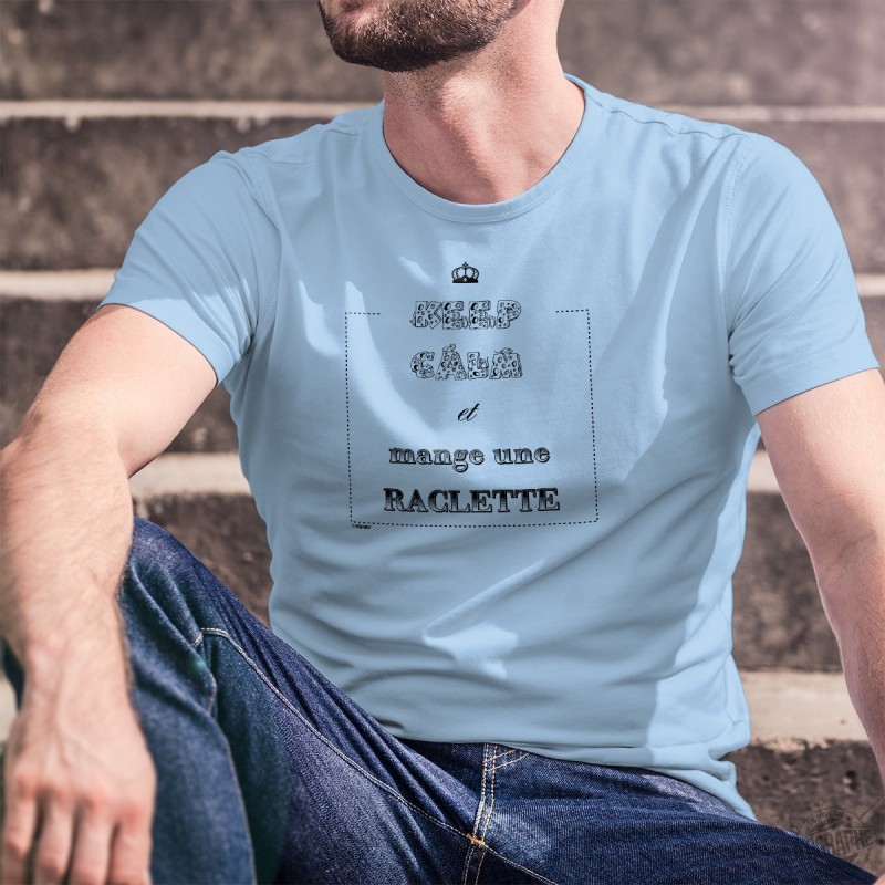 Humorous T-shirt illustrated with the quote in French " KEEP CALM et mange une RACLETTE"
