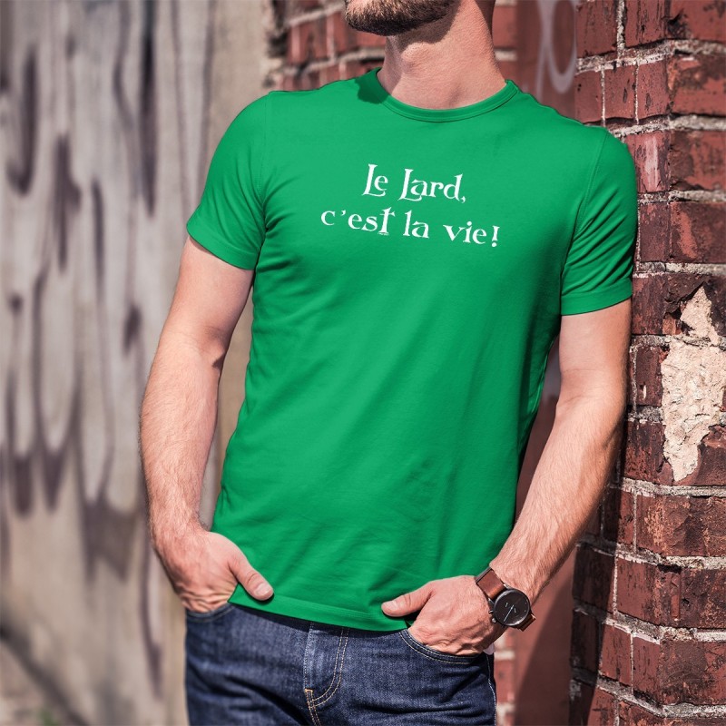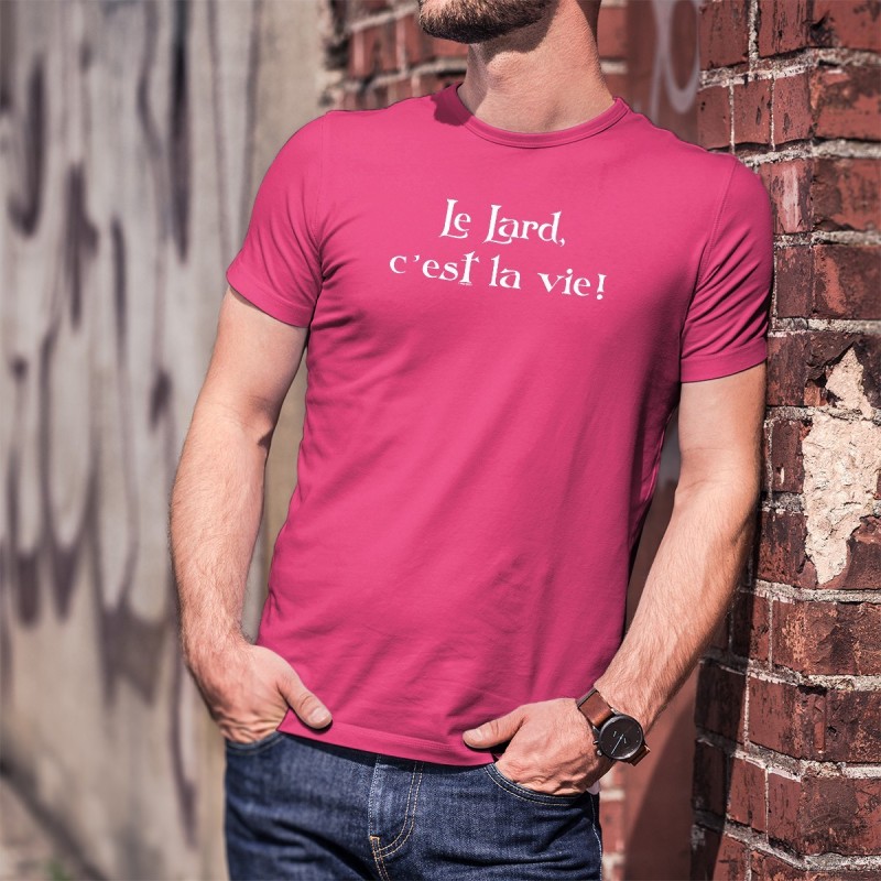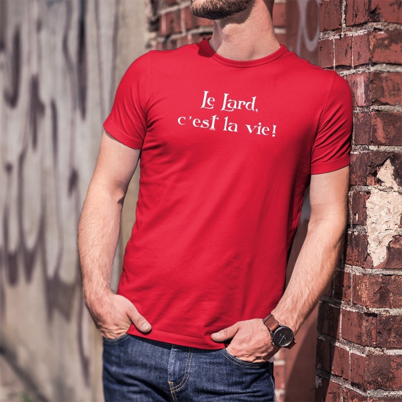 Men's Fashion cotton T-Shirt illustrated with humorous french quote, "Le lard, c'est la vie ★ Corpore sano ★