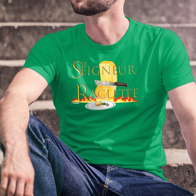 Men's Fashion cotton T-Shirt illustrated with humorous french quote, "Le Seigneur de la Raclette"