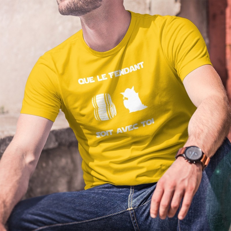 Men's Fashion cotton T-Shirt illustrated with humorous french quote, "Que le Fendant soit avec Toi"a wink to the famous replica "May the Force be with you" from Star Wars movies