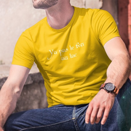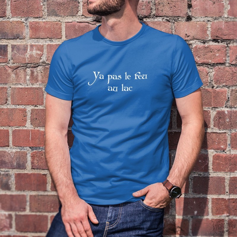 Men's Fashion cotton T-Shirt illustrated with humorous french quote, "Ya pas le feu au lac"