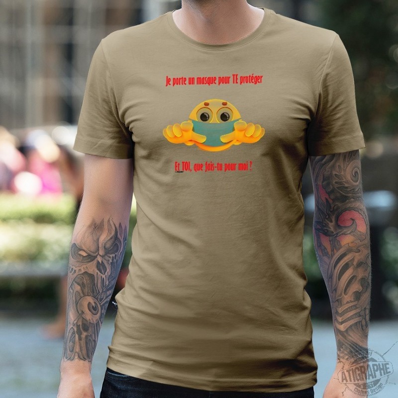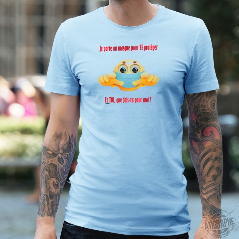 Men's Fashion T-shirt illustrated with "Je porte un masque pour TE protéger ✪
