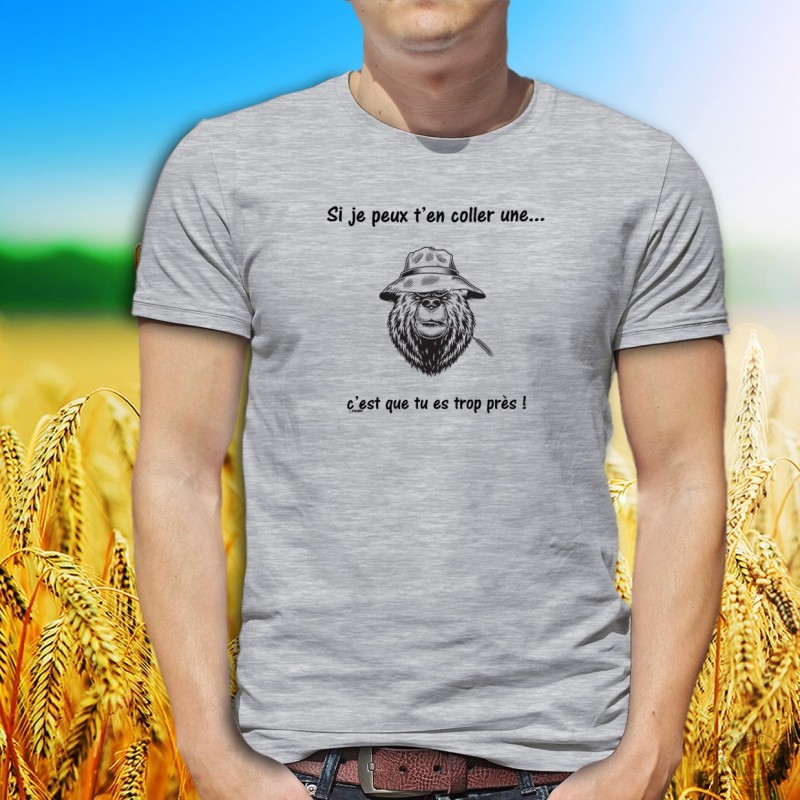 Men's Fashion T-shirt illustrated with "Si je peux t'en coller une ✪ c'est que tu es trop près ✪