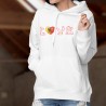 White hoodie for women illustrated with the word "LOVE" (love) the "O" being represented by a Geneva heart