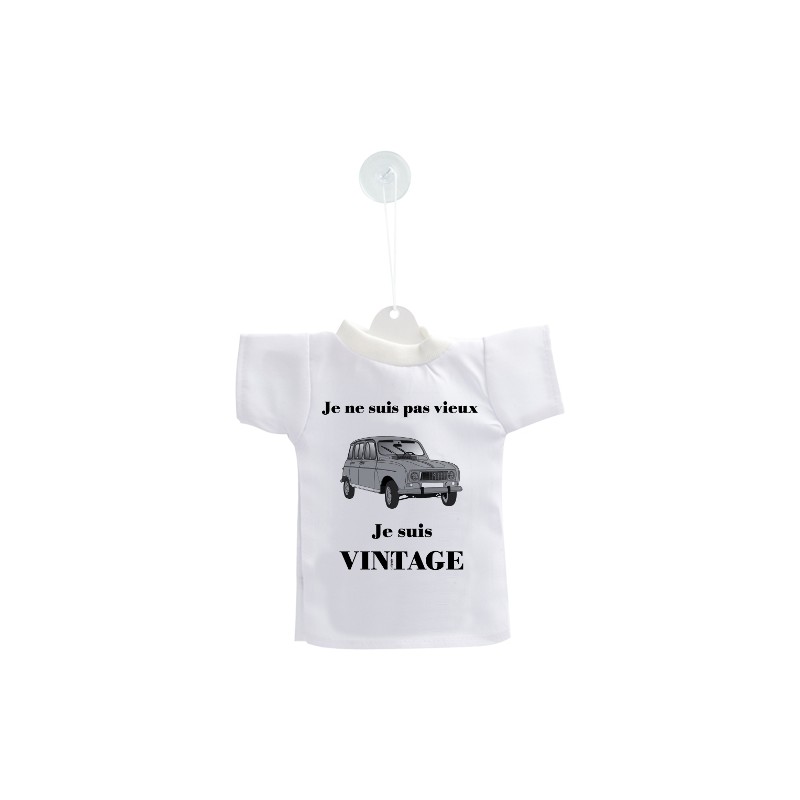 Car's Customization Mini T-Shirt illustrated with humorous french quote, "Je ne suis pas vieux, je suis vintage" and an old Renault 4L car