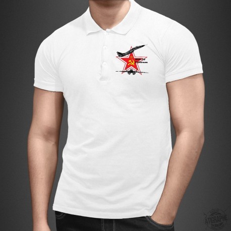 Men's fashion Polo Shirt illustrated with the silhouette of the fighter plane - Mikoyan-Gurevich MiG-29 Fulcrum, famous remnant of the Cold War, as well as the red star, hammer and sickle, symbols of the USSR