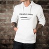 Humourous hooded men's white sweatshirt illustrated with humorous french quote, "Réveil en cours, merci de ne pas brusquer"
