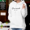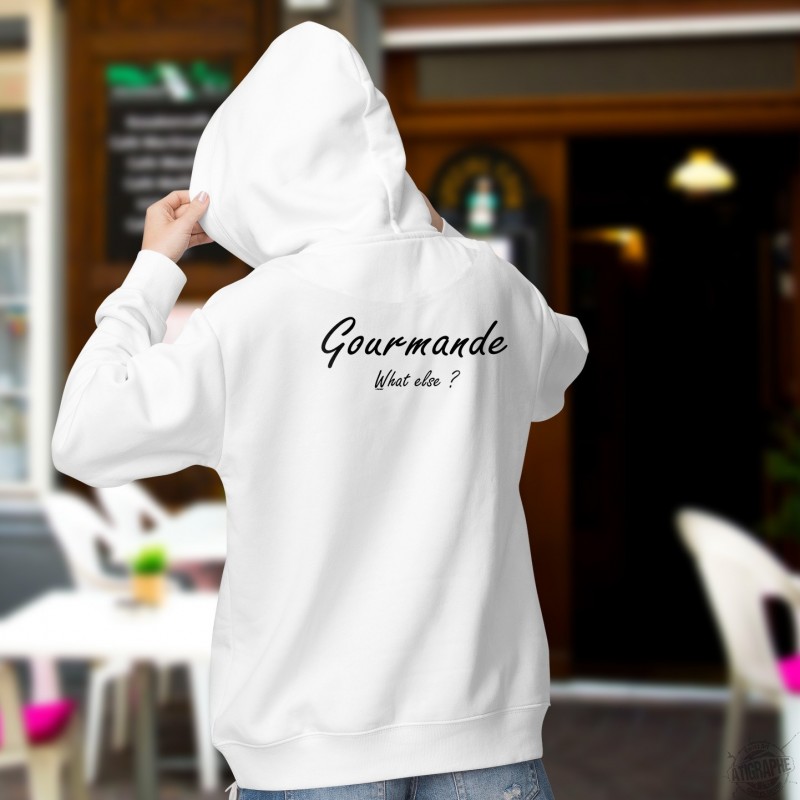 White hooded fashion sweatshirt illustrated with the quote "Gourmande, What else?", A digression of George Clooney's famous phrase for a coffee brand