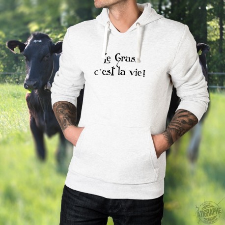 Humourous hooded men's white sweatshirt illustrated with humorous french quote, "Le Gras, c'est la vie"