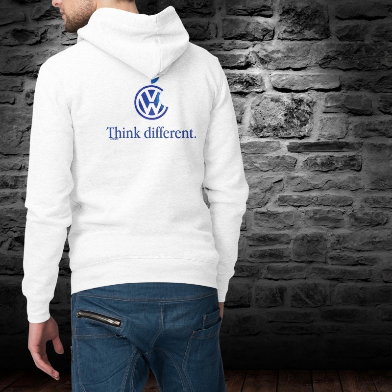 Men's white hoodie with the Volkswagen logo resembling a crunchy apple and the phrase inspired by the smartphone brand ★ Think different ★