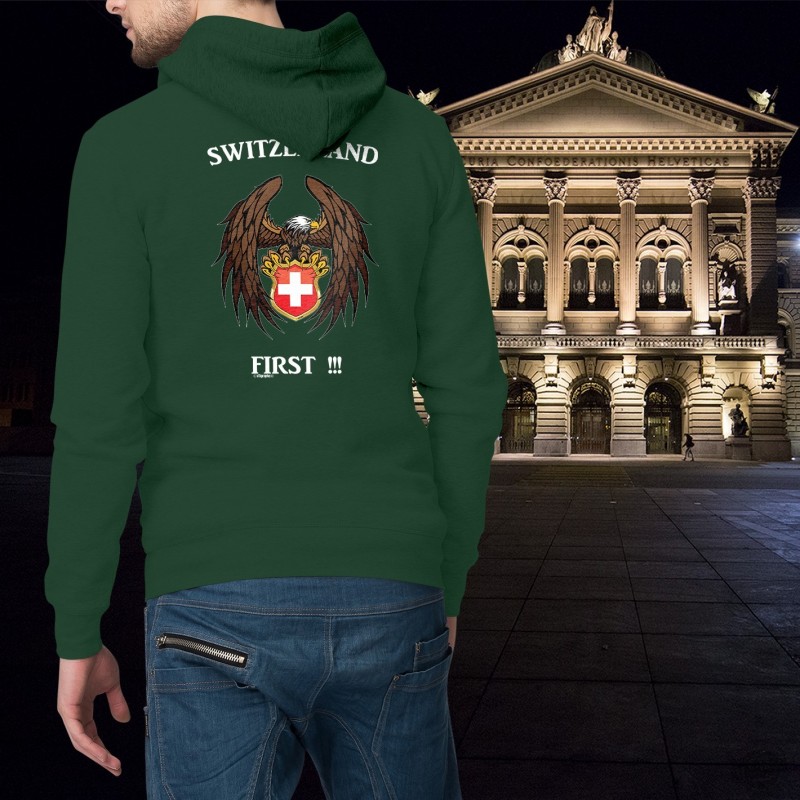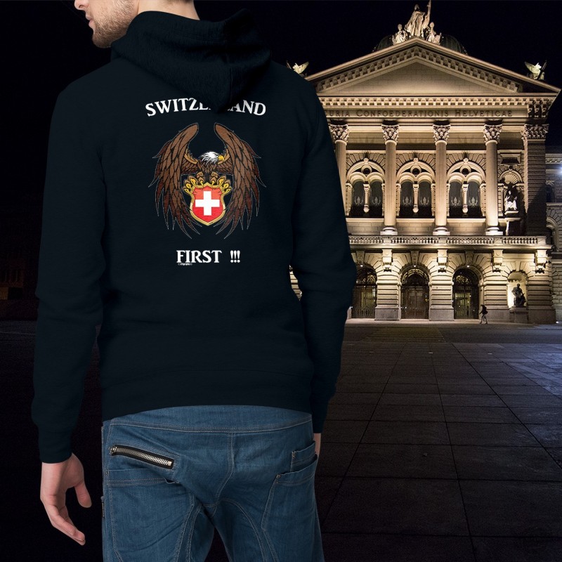 men's fashion cotton Hoodie illustrated with the quote ✚ Switzerland First ✚ of an eagle holding the coat of arms of the Swiss Confederation between his claws